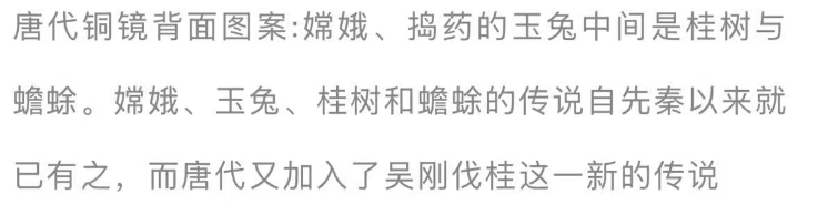 在唐代,月宫有了正式名称。据唐代典籍《明皇杂录》记载,唐明皇曾在中秋之夜游月宫,看见大门上悬挂有“广寒清虚之府”的匾额,广寒宫之名自此而流传。唐宋时期的诗文中,关于嫦娥、玉兔已经频繁出现,到明清时期的诗词中,吴刚也和嫦娥联系到一起。但嫦娥变成癞蛤蟆这一说法实在不够雅观,故而这个版本在流传过程中逐渐被抛弃,取而代之的是一段凄美的爱情传说:后羿请得不死药之后,交给妻子嫦娥保管,没想到后羿的徒弟逢蒙(又作逄蒙)心术不正,企图窃取不死药,嫦娥被逼无奈,为了不让灵药落入歹人之手,只得自己吞食灵药飞升,但因不忍离开丈夫后羿,于是滞留月宫,而后催促吴刚伐树,玉兔捣药,以期早日练出灵药重返人间与夫君团聚。这个凄美故事中,将嫦娥奔月、吴刚伐桂、玉兔捣药全部串联起来,而嫦娥形象也从偷窃灵药变成了被逼吞药的悲情女子,最容易被百姓所同情和喜爱。小学语文教材中《嫦娥奔月》也采用了这个版本的传说,可视为奔月传说的“权威版本”。